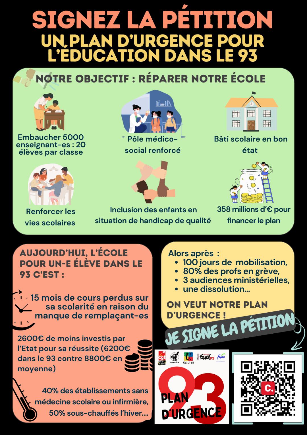Face à cette situation d’urgence, une mobilisation d’ampleur pour un Plan d’urgence pour le 93 a alors été lancée au printemps 2024 à l’appel de l’intersyndicale éducation FSU 93 - CGT Éduc’Action 93 - SUD éducation 93 - CNT éducation 93 et de l’association de parents d’élèves FCPE 93. Enseignant.es, personnels, parents, élèves et élu.es se sont uni.es pour exiger un choc des moyens avec deux correctifs budgétaires pour sauver l’école publique : un pour le bâti et un pour les moyens humains. Ce dernier, à la hauteur de 358 millions d’euros au moins, demandait la création de postes manquants :