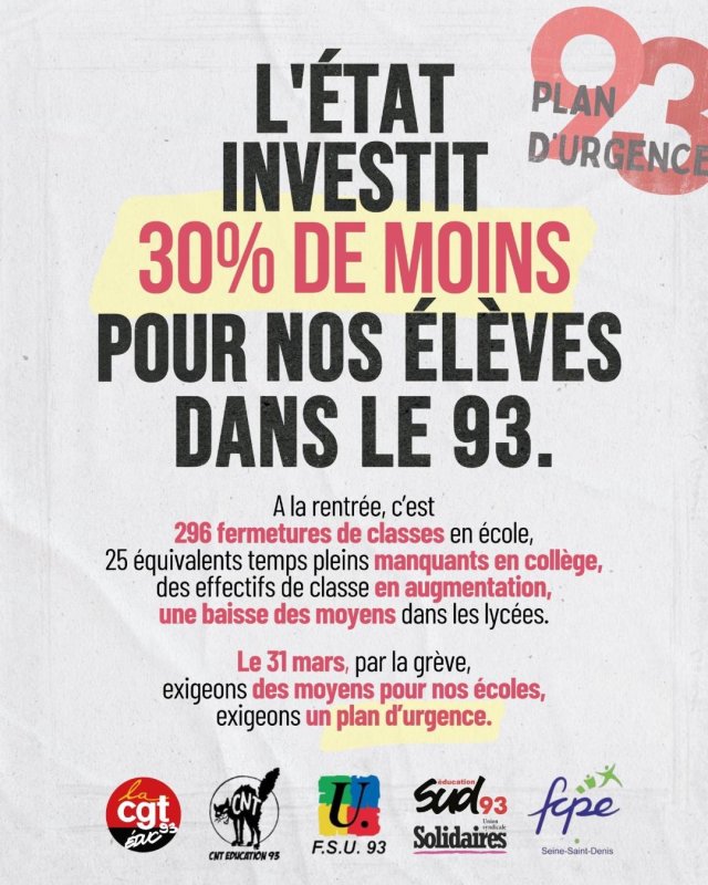 L’intersyndicale FSU-CGT-SUD-CNT appelle à un cortège 93 dans la manifestation du 31 Mars à Paris. 14h00 au départ de la station RER Luxembourg.